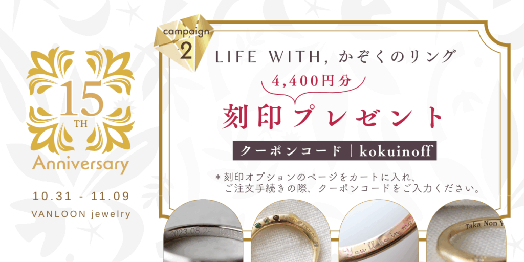 VANLOON jewelryからは、かぞくのリングやLIFE WITHリングの刻印代(4,400円)のクーポンをプレゼント!(対象のリングはこちらから)