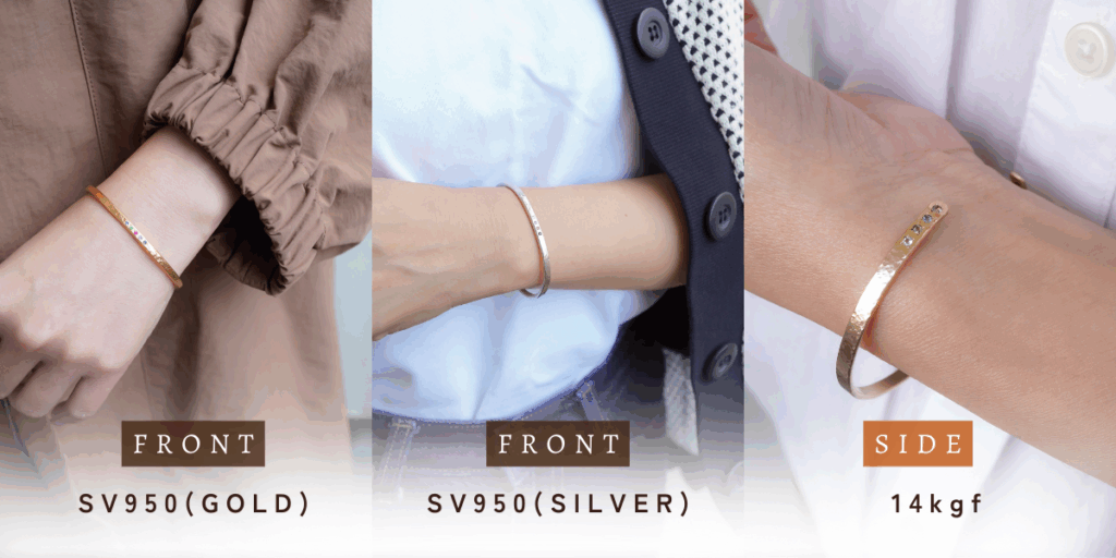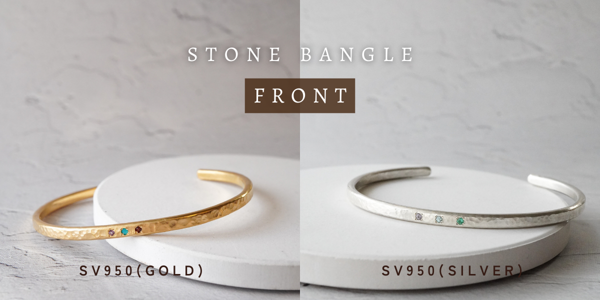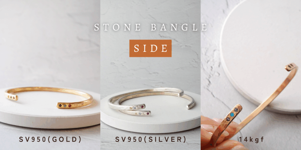 同じストーンバングルでも、素材や石の位置によって印象が変わります。
