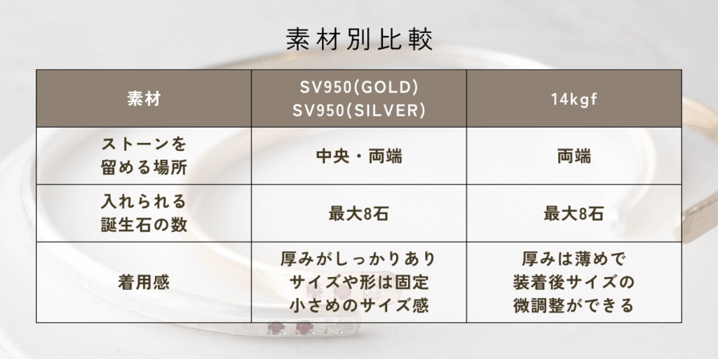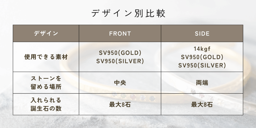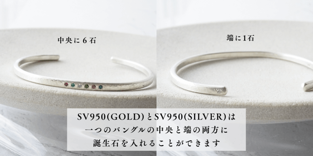 SV950(GOLD)とSV950(SILVER)の素材をお選びいただくことで、正面と端の両方に誕生石を入れることができます。