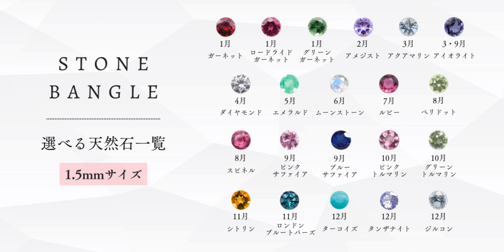 誕生石のサイズは全てのバングルの種類を通して1.5mmとなります。